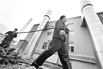 图:西罗园供暖分公司两位司炉工抬着一根往年用作燃煤锅炉维护的生锈铁钎送往仓库,身旁的新型燃气锅炉房将采用全自动化的操作模式,铁钎等工具将成为尘封的历史记忆。