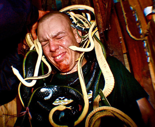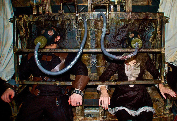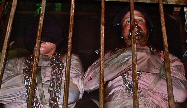 要从这间鬼屋走出去预计需花上8个小时,里面全都是恐怖电影的剧情,包括被泼假血、捆绑、被逼吃臭鸡蛋,甚至被关入塞满蛇的笼子中。鬼屋开幕至今还没有人能走完全程,连美国海军陆战队员也以失败收场,鬼屋还让几十位男生流下了男儿泪。 图为鬼屋里面全都是恐怖电影的剧情。
