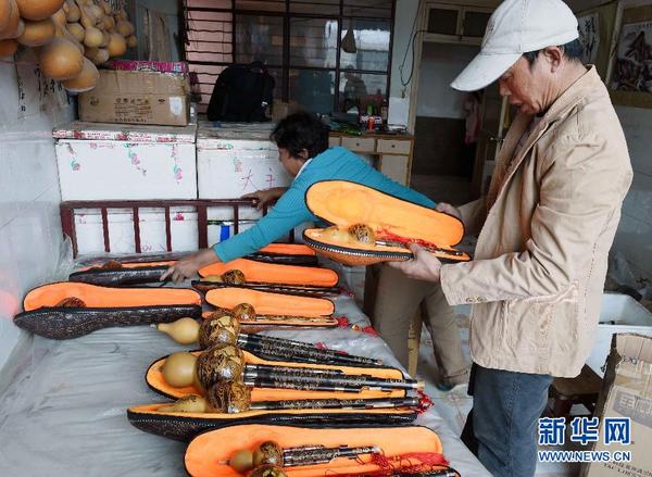10月28日,夏玉平和妻子余梅仙在包装制作好的民族乐器。云南省曲靖市富源县大河镇薅菇田村农民夏玉平和妻子余梅仙自幼残疾。1991年,夏玉平离妻别子到昆明教育学院制作乐器专业潜心学习了7年乐器理论、乐器制作,课余时间到工厂学做吹管乐器。1998年,练就娴熟技艺的夏玉平回到家乡,与妻子创办“云南玉平乐器社”,在当地政府的扶持下,还带动农民种植1000亩紫竹为乐器社提供原材料,增加了群众的收入。如今,夏玉平和妻子余梅仙成为当地有名的文化专业户,他们制作的葫芦丝、巴乌、笛子、洞箫、三弦、二胡等民族乐器品质精良,畅销北京、上海等14个省市,并出口到日本、韩国、新加坡、越南、缅甸等国家。2013年,夏玉平被曲靖市政府授予“非物质文化遗产乐器制作代表性传承人”称号。新华社记者杨宗友摄