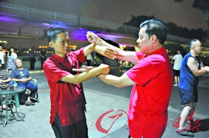 在本报记者专访期间,霍振球(红衣左)和何健棠在馆前的江边空地上玩起了黐手。 本报记者 施绍宗 摄