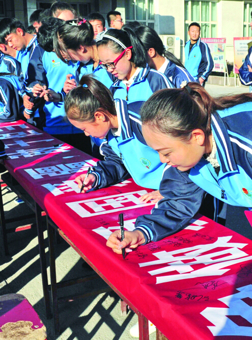10月29日,新疆农业职业技术学院学生在“争做爱国爱疆、敢于担当的当代优秀大学生”布标上签名。