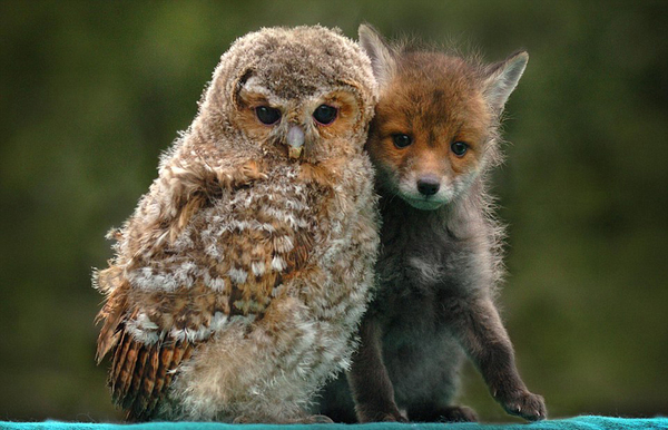 一只猫头鹰和一只狐狸幼仔紧紧依偎在一起。(网页截图)