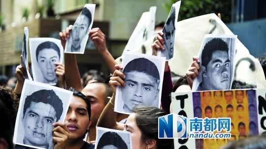 43名师范学校学生失踪事件在墨西哥多个地方引发民众抗议。抗议者高举失踪者的照片。
