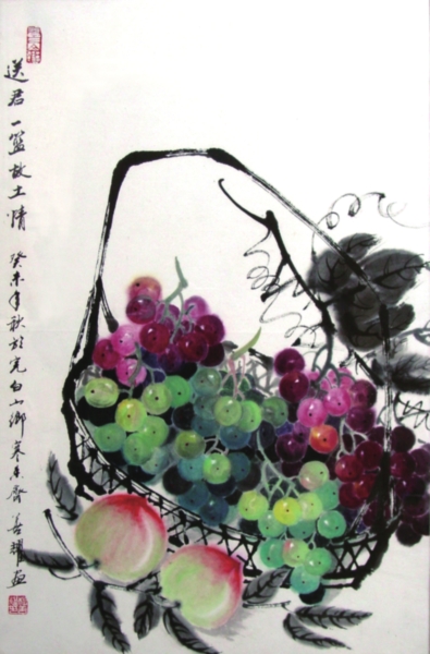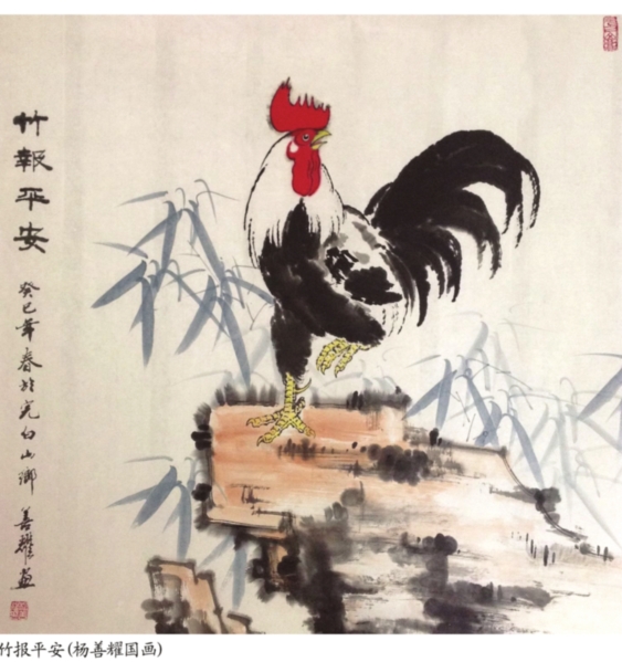 画家杨善耀是把自己生命的根须深深地扎入到乡土之中,这种深入不是一种空洞的诗意和居高临下的优越感。他是一名中医,也是一位农民,能够最大程度地亲近土地,亲近劳动。透过《竹报平安》、《鱼乐图》、《送君一篮故土情》等画作,我们能感受到画家与作物们、动物们、乡民们生活在一起。他的画面语言是质朴的、诚恳的,他笔下动物的体态和神态是一种浑然的自在和质朴,经过画家的眼光和画笔的描摹点染,都如璞玉获得了灵性,绽放出独特的审美意味。