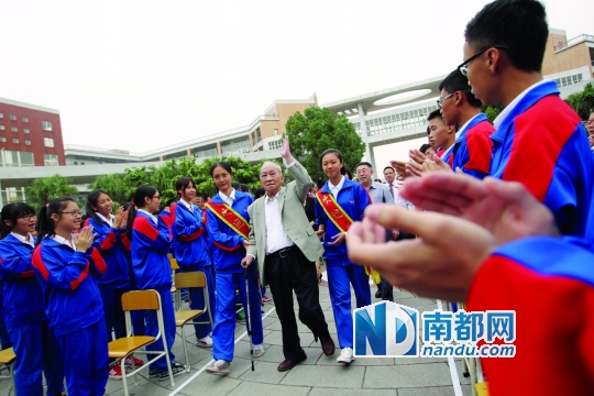 11月3日下午,江门一中。同学们鼓掌欢迎梁思礼的到来。 南都记者 孙振飞 摄
