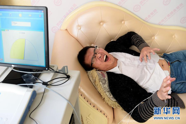 11月3日,在济南一家妇产医院,一位志愿者在体验模拟分娩的阵痛。当日,“感恩母爱——分娩阵痛体验”活动在这家妇产医院举行,志愿者在医护人员的指导下进行“分娩痛楚”极限体验。新华社记者 郭绪雷摄