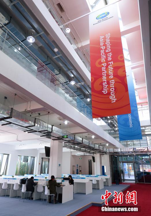 11月3日,部分媒体记者应邀前往位于北京市怀柔雁栖湖畔的2014年亚太经合组织(APEC)领导人非正式会议会场采访,图为新闻中心内的工作平台。中新社发 侯宇 摄