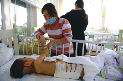 苏万成患有多发骨破坏,脊柱椎体破坏,由于前天刚刚接受了一次手术,苏万成的脊背上的伤口尚未愈合。按照医生的嘱咐,他只能一直侧身躺着。