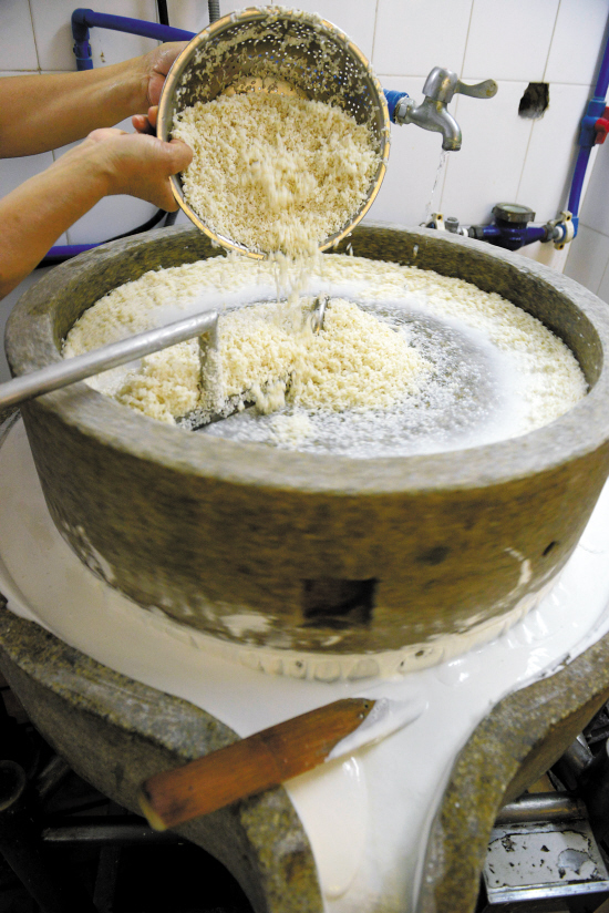 将清洗、浸泡过的上好大米用石磨磨成粉浆