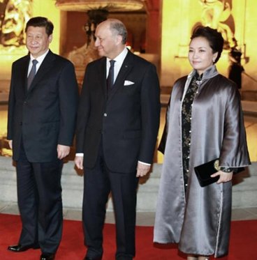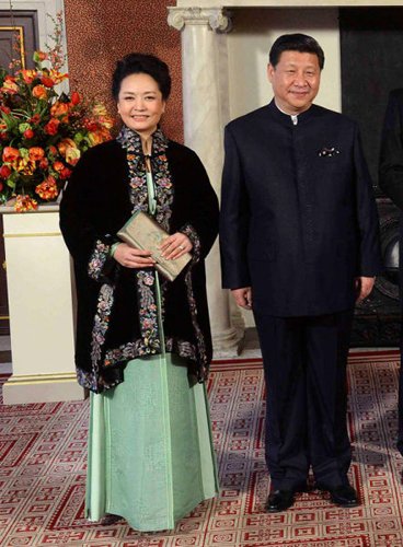 2014年3月22日,习近平和彭丽媛抵达荷兰阿姆斯特丹,并出席亚历山大国王举行的盛大国宴。彭丽媛当晚穿的黑底牡丹花刺绣饰边对襟大褂和粉青色长裙都是很有特点的中式传统服装,并且非常适合国宴上的隆重气氛。