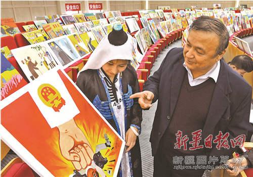走进新疆国际会展中心五楼报告厅,一幅幅艳丽、生动的农民画作格外吸引人。有的画作描绘了各族群众用铁拳砸碎暴恐分子的阴谋;有的描绘了各族群众如石榴籽一般紧紧地团结在一起;还有的作品真实地表现了各族群众通过手机、电脑等科技手段获取信息的现代化生活场景……