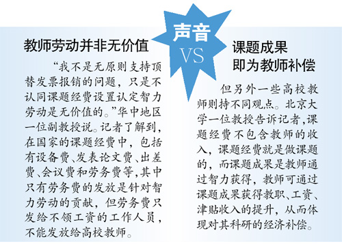 “我不是无原则支持顶替发票报销的问题,只是不认同课题经费设置认定智力劳动是无价值的。”华中地区一位副教授说。记者了解到,在国家的课题经费中,包括有设备费、发表论文费、出差费、会议费和劳务费等,其中只有劳务费的发放是针对智力劳动的贡献,但劳务费只发给不领工资的工作人员,不能发放给高校教师。
