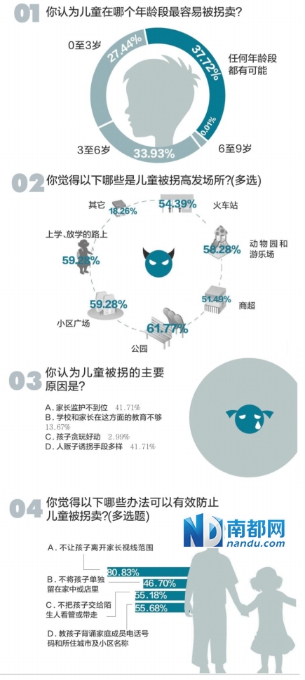 南都鹏城通记者选取小区广场、学校、商业街、菜市场等儿童被拐七大高发场所实地调查发现,不少儿童在无家长陪同的情况下独自玩耍,还有部分家长在陪护孩子过程中只顾低头玩手机,全然不知孩子已离开自己的视线。南都民调中心和大粤网近期就防拐话题开展了一项问卷调查,1002位受访者当中,过半人认为公园、小区广场和上下学的路上是儿童被拐高发场所,其次是动物园、游乐场、火车站和商超。家长监护不到位和人贩子拐骗手段多样被认为是儿童被拐的主要原因。