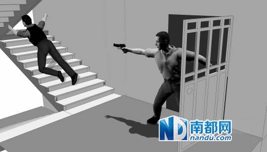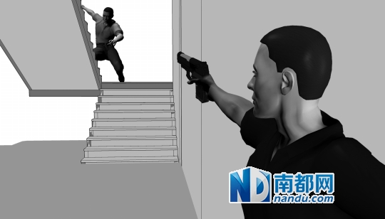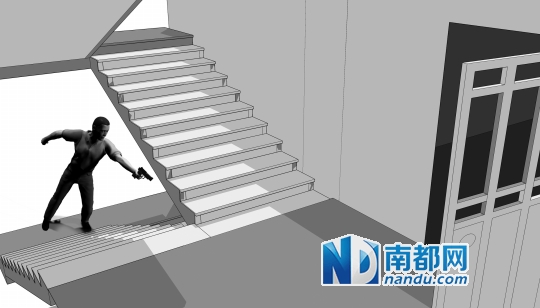 4 歹徒边射击边朝3楼逃窜,但遭到守候在3楼的民警的火力压制。
