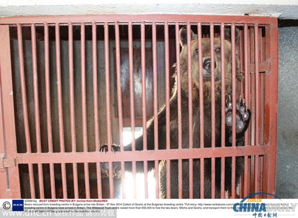 当地时间2014年11月11日报道(具体拍摄时间为2014年11月7日),英国,两只出生于1998年的棕熊Milcho和Gosho被人们从保加利亚的繁殖中心救出,目前已经抵达英国肯特。但因为有狂犬病风险,两只熊将会被隔离4个月,在那之后,它们将被送往更大的,更贴近自然环境的圈地生活。Milcho和Gosho生于1998年,之前它们出生的目的就是为了被人射杀,幸好自1993年之后,因熊被归为保护动物,这项残忍的活动终止了。