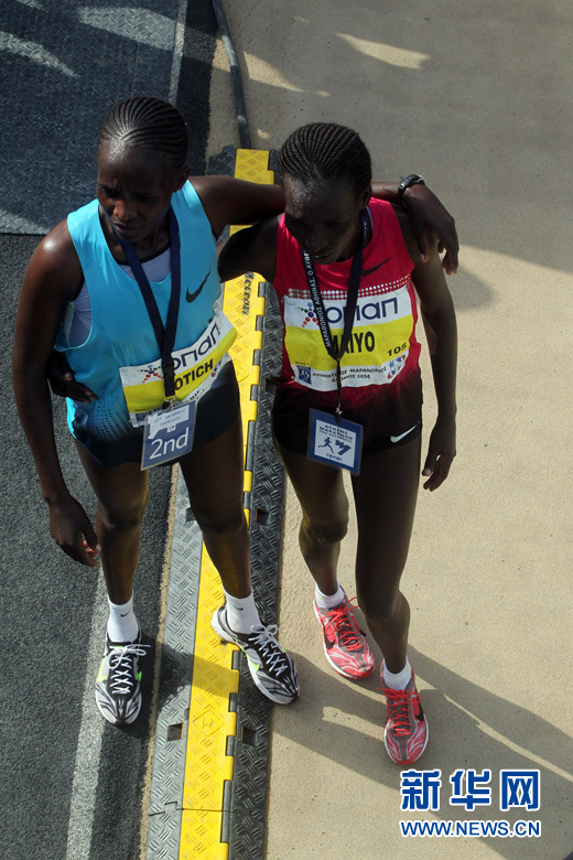 在9日举行的第32届雅典始祖马拉松比赛中,肯尼亚选手梅约(Naomi Jepkogei)以2小时41分05秒的成绩获得女子组冠军,她的同胞罗蒂奇(Nancy Joan Rotich)以2小时41分28秒的成绩获得女子组亚军。图为梅约(红衣者)和罗蒂奇在终点拥抱。罗洛斯摄 新华网发