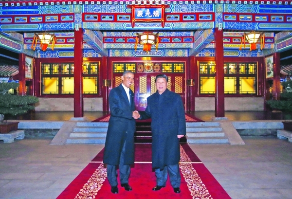 晚上的中南海,水波荡漾,树影婆娑。习近平在瀛台前迎接奥巴马,两国元首亲切握手,互致问候。习近平说,你这次访问日程很紧。我们既安排了国事访问的正式活动,也安排了一些轻松场合。希望你的访问愉快,取得丰硕成果。