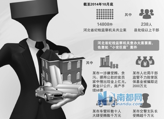 据通报,在加大查办大案要案力度的同时,河北省纪检监察机关坚持“老虎苍蝇一起打”,严肃查处了一批发生在群众身边的“小官巨腐”案件。这些案件中,有的市车管所数十人大肆受贿数千万元,有的市交警支队长受贿超千万元,有的市人社局干部监管不力致使医保基金被骗取近2000万元,有的县国土资源局原局长受贿和巨额财产来源不明总额近千万元,甚至有村干部利用协助征地时机受贿百万元。这些案件涉案金额巨大且发生在群众身边,社会影响恶劣,群众反映强烈。![]()