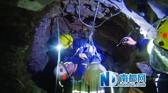 在坑洞内,被困男子情绪激动,救援小组进行疏导,逐渐让其情绪稳定,随后展开救援,先是尝试用简易担架将其拉出,但由于坑道有一定深度,加之被困者体型较胖,担架操作起来很不方便。