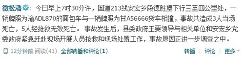 人民网北京11月15日电 据四川松潘县县委宣传部官方微博“微松潘”消息,今日早上7时30分许,国道213线安宏乡段德胜堡下行三至四公里处,一辆牌照为渝ADL870的面包车与一辆牌照为甘A56666货车相撞,事故共造成3人当场死亡,5人经抢救无效死亡。