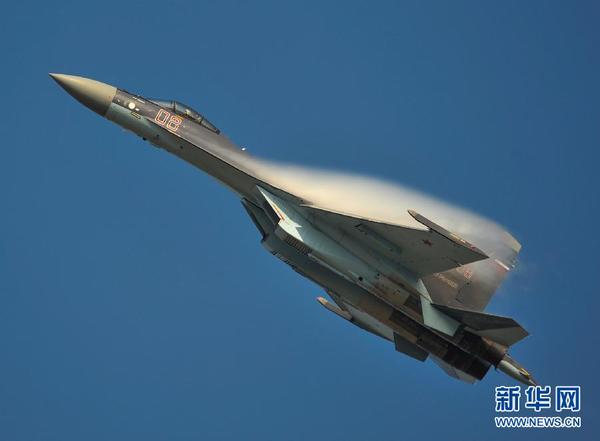 11月15日,俄罗斯Su-35飞机在大迎角上升时产生翼面的水雾。当日,珠海金湾机场迎来久违的蓝天,参加第十届中国国际航空航天博览会的各国飞行表演队纷纷振翅比翼,在蓝天上抒写美丽篇章。由于珠海空气中含水量较高,而飞机在表演时由于常有大迎角机动动作,导致气流剥离翼面形成翼面附近的真空状态,气温骤降,空气中的水蒸气凝结为雾,所以经常可以看到飞机机翼或翼梢带着美丽的白色水雾,形如飞机的另一双翅膀。新华社记者 杨光 摄