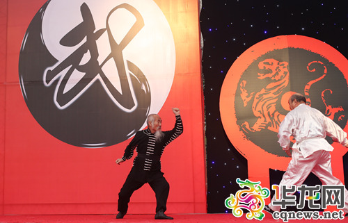 15日上午,重庆市首届武术文化节暨“争做群众身边的好体育人”服务群众示范活动开幕,不少武林门派的传承人上台表演武术绝技。 首席记者 罗嘉 摄