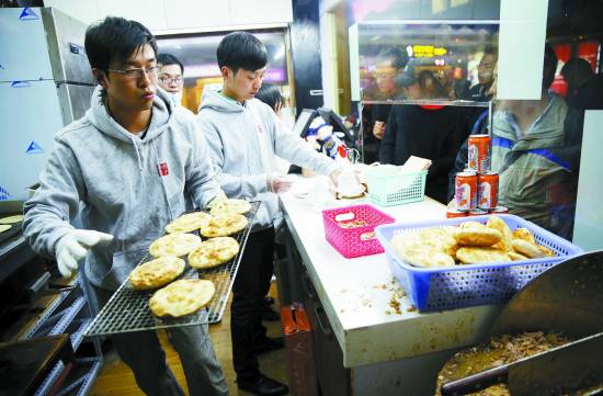 4月20日,北京西少爷肉夹馍店,宋鑫(前)在烤饼,孟兵在招呼顾客。 CFP供图