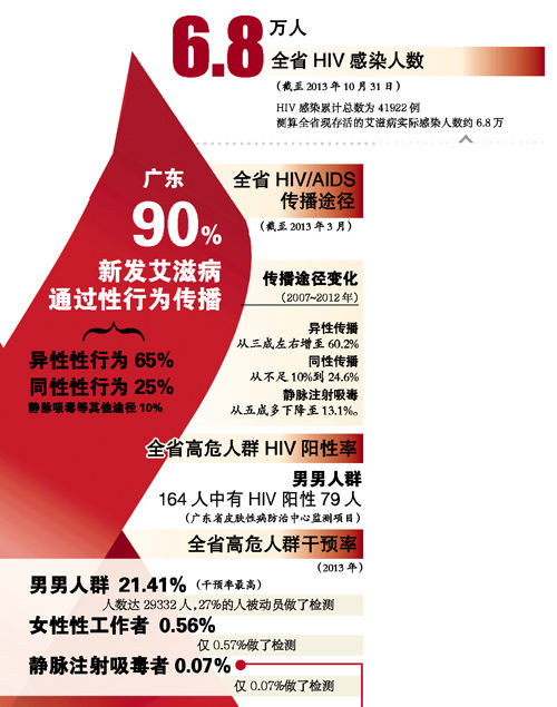 2014年12月1日为第27个艾滋病日,全省各地艾滋病防治宣传活动启动。记者从广东省性病艾滋病防治协会获悉,与联合国艾滋病规划署最新公布的我国感染艾滋途径分布数据一致,广东九成新发艾滋病是通过性来传播的,其中异性性行为65%,同性性行为25%。哨点监测发现,男男人群中,HIV流行率高,HIV阳性率7.3%。最新发现,年龄最小的艾滋病感染者是一名学生,仅12岁。