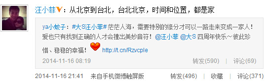 【摘要】 11月16日是大S和汪小菲结婚四周年的纪念日,当晚,汪小菲在微博上转载一条网友制作的祝福视频,并写道:“从北京到台北,台北北京,时间和位置,都是家。” 这条视频收集了大批大S和汪小菲的各种甜蜜瞬间,可以看出两人从相恋到结婚生子一路幸福。