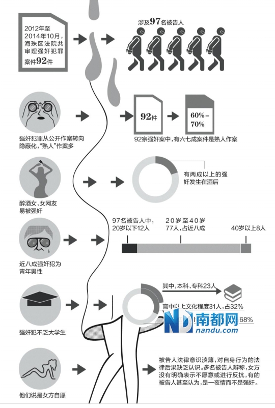 海珠区法院的法官称,在传统观念中,强奸案件往往以偏僻地点、陌生男子、暴力胁迫为特征。然而,近年来强奸犯罪出现了多是熟人作案的特点。在海珠区法院近3年审理的92宗强奸案中,有六七成案件是熟人作案。他们往往利用朋友、同事、老乡的关系实施强奸,趁被害人不备,采用灌酒、下药等方式致被害人意识不清,趁机实施强奸行为。