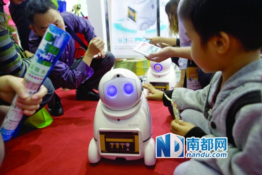 本届高交会7号展馆展出的这款亲子机器人具有环境感知、自主导航和避障等功能,为6岁以下幼儿设置超过100种幼教应用程序。南都记者 王子荣 摄
