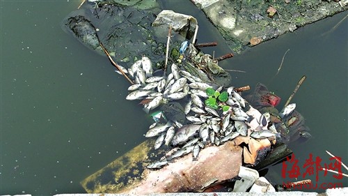 【马上核实】昨日上午,记者在该小区看到,这条名叫“牛栏尾”的小河,在小区范围内的河道有200多米长,河水时不时传来臭味。在河道通向下店路的一座公路桥下,漂浮着大量死鱼的尸体。