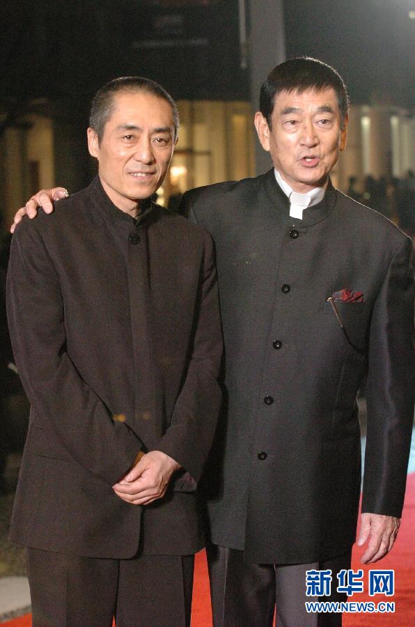 这是2005年10月22日在日本东京拍摄的高仓健(右)与中国导演张艺谋出席第18届东京国际电影节开幕式的资料照片。 新华社记者马平摄
