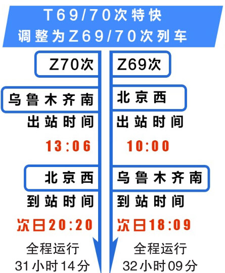 11月18日,乌鲁木齐铁路局召开实行新运行图新闻通气会宣布,自12月10日起,全国铁路实行旅客列车新运行图,这是今年7月1日调图后,铁路部门对列车运行图进行的又一次较大调整。届时,新疆铁路将有75趟列车运行时刻调整,33趟旅客列车停站发生变化,同时新增开旅客列车,并对部分旅客列车等级、运行路线进行了调整,再一次扩充进出疆和疆内线路客运能力,方便各族旅客出行。