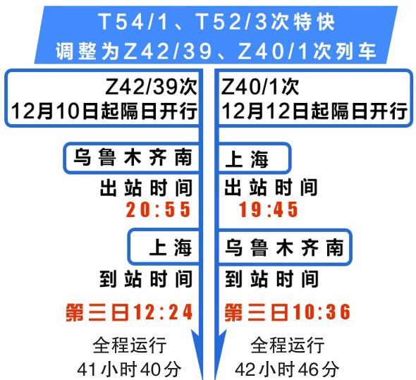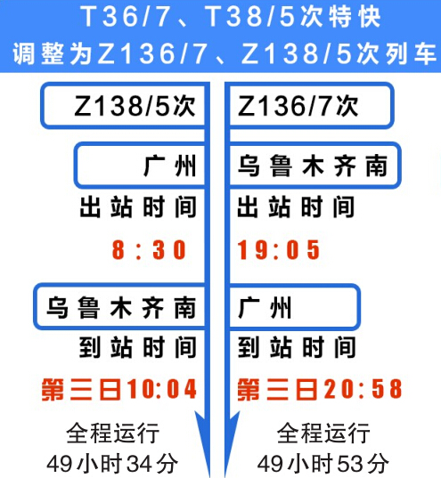 据黄新介绍,此次调图后对乌鲁木齐南至广州、北京、上海、济南(乌鲁木齐南至济南K185/6次特快列车车次、时刻、开行日期另行公布)4对列车时速由现行的140公里提高至160公里,运行等级提升为直达特快旅客列车,并仍执行现行票价。目前公布的这3对出疆列车调图前后全程运行时间压缩了51分钟至5小时34分钟不等。