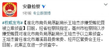 人民网北京11月19日电 据安徽省人民检察院官方微博消息,日前,经省检察院指定,亳州市检察院以涉嫌受贿罪对淮北市商务局原副局长王培杰予以立案侦查。王培杰曾任淮北市濉溪县县委常委、经开区管委会主任。目前,此案正在进一步侦查中。