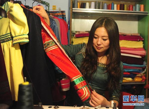关鑫与她设计的服装在一起(11月18日摄)。关鑫是一名80后的满族姑娘,2002年毕业于内蒙古工业大学纺织学院服装设计专业,毕业后一直在一家服装厂工作。她对服装设计,特别是具有蒙古族特色的现代服装设计有浓厚的兴趣,抱着想把自己的设计理念展现给大家的想法,关鑫于2013年开设了自己的服装店。开店一年来,通过顾客口口相传和微信朋友圈展示等,关鑫的客户数量逐渐上升,生意也随之红火起来,前段时间,还有山东烟台的顾客想加盟代理。 30多平方米的店铺里,她自己设计、裁剪、制作。关鑫说,民族元素与时尚并不矛盾,既特别