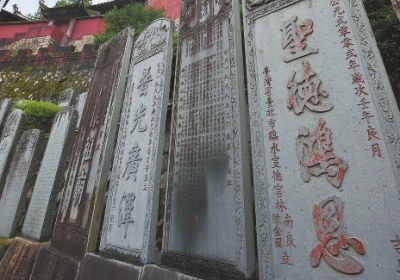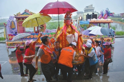 ①临水宫正门。②正殿中的陈靖姑真身。③碑林石刻把海峡两岸连成一气,让祖殿分宫串成一脉。④陈靖姑文化节,两岸信众前来朝圣、祈福。⑤台湾靖灵宫信众冒雨迎接。 林兴华 摄⑥遥望千年临水宫。![]()