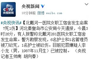 人民网北京11月20日电 据中央电视台新闻中心官方微博消息,河北秦皇岛市公安局今天通报,今晨3时26分,有人报警称北戴河281医院女职工宿舍发生命案。警方勘察发现,6名护士和1名管理员被刀砍死,1名护士被砍伤。目前犯罪嫌疑人李小龙(男,1987年11月生)已被控制。