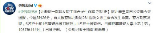 中新网11月20日电 据中央电视台新闻中心官方微博消息,河北秦皇岛市公安局今天通报,今晨3时26分,有人报警称北戴河281医院女职工宿舍发生命案。警方勘察发现,6名护士和1名管理员被刀砍死,1名护士被砍伤。
