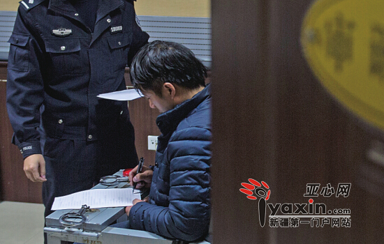 11月20日14时57分,在五家渠市垦区公安局刑侦大队,办案民警请肇事司机余志(化名)在传唤证上签字确认。图/亚心网记者陈峰