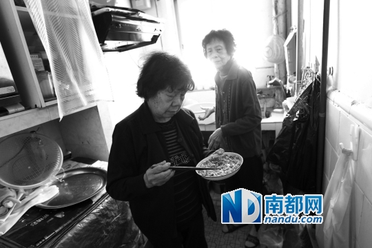 一个掌勺,一个打下手,何秀珍老人(左)和黎炎玲老人常一起买菜做饭,互相照顾十几年。 南都记者 马强 摄