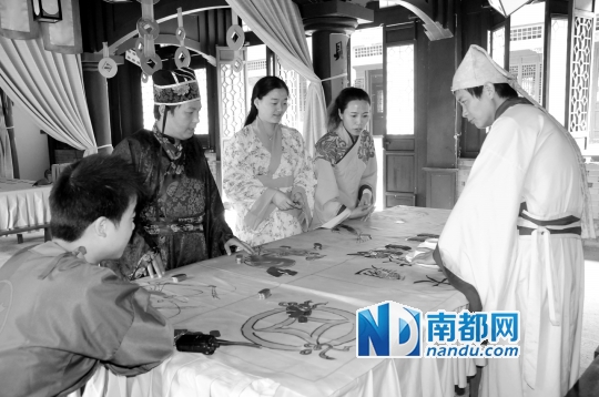 →进到寮步香市影视城,穿上明朝时的衣服,体验一把穿越的感觉。南都记者何永华通讯员周雪平 摄