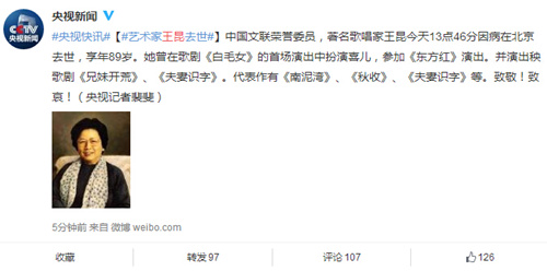 人民网西安11月21电(任志慧) 今天下午,中央电视台新闻中心官方微博“央视新闻”微博称:“中国文联荣誉委员,著名歌唱家王昆今天13点46分因病在北京去世,享年89岁。她曾在歌剧《白毛女》的首场演出中扮演喜儿,参加《东方红》演出。并演出秧歌剧《兄妹开荒》、《夫妻识字》。代表作有《南泥湾》、《秋收》、《夫妻识字》等。致敬!致哀”!