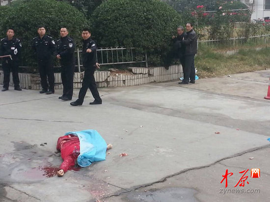 11月23日下午,郑州大学第五附属医院住院部楼下,一名身穿红衣的女性倒在地面,身下有一摊血迹,数名警察正在对现场进行勘查。据了解,死者名叫王某,今年78岁,生前在该院住院部1号楼8楼消化二科住院,诊断为支气管肺炎,11月18日入院,距今仅5天。