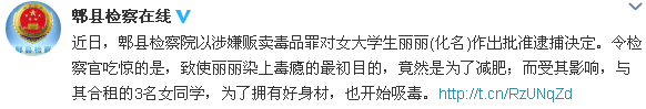 人民网北京11月24日电 据成都市郫县人民检察院官方微博消息,近日,郫县检察院以涉嫌贩卖毒品罪对成都一名女大学生作出批准逮捕决定。令检察官吃惊的是,致使该名女大学生染上毒瘾的最初目的是为了减肥。而受其影响,与其合租的其他3名女同学,为了拥有好身材,也开始吸毒。