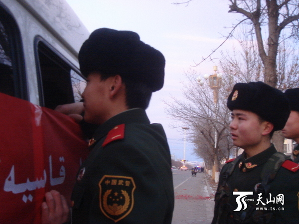 天山网讯(通讯员杨化光摄影报道)11月24日,武警新疆裕民县中队的10多名退伍老兵怀着对绿色军营的留恋和热爱,挥泪与战友惜别,踏上返乡归途。