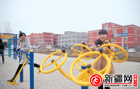 11月25日,在乌鲁木齐七道湾北路西五巷,家住附近的居民杨梅(右)和同伴在使用新安装的健身器材锻炼身体。