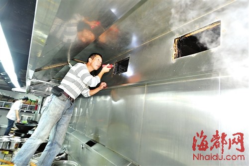 “在最近检查中,这种洗管道不洗净化器的现象比较突出。”环保执法人员介绍,不少保洁公司只是把管道的油垢刮掉,防止油垢积聚发生火灾,而没有涉及清洗净化器。究其原因,一方面是净化器安装时就不规范,“净化器安装在半空,那后期怎么清洗?”因此清洁公司也干脆不洗。另一方面,也有可能是清洁公司本身不规范,“有些公司为省成本,直接把净化器的静电吸附片丢掉,结果净化器成了空壳。”