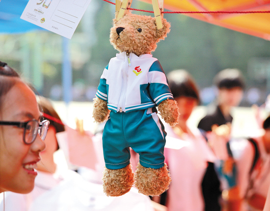 学生开设的各式纪念品档口也开张大吉,校服熊、T恤衫、明信片等大热卖。今年即将出国留学的省实国际班学生何任,不久前拿到了111分的托福成绩单,刷新了省实学生托福成绩的新纪录。在校庆这一天,他带着最新出版的全英杂志《Vision》在现场义卖。这是他在课余时间和同学一起创作的刊物,重点关注公益慈善,比如反对冰桶效应浪费水资源,到粤北山区帮扶贫困学生等,“我们印刷了300份,每份10元,准备把筹到的善款捐给慈善机构。”